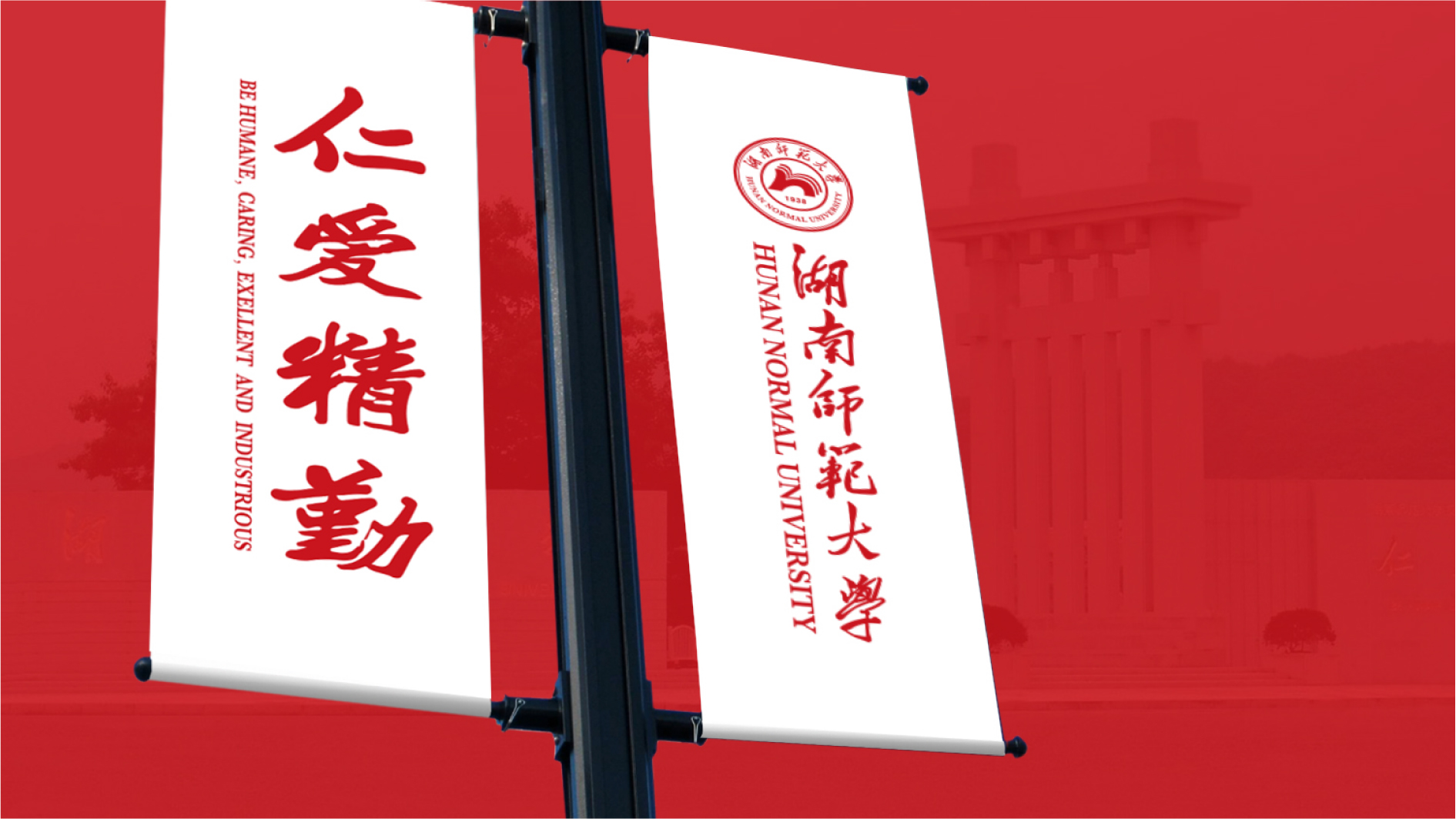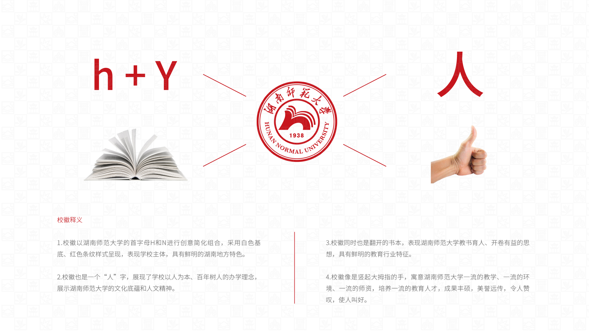 校徽是學(xué)校的品牌標(biāo)志,可以規(guī)范師生的行為,提高學(xué)校的知名度。和與德為湖南師范大學(xué)更新,校徽以湖南師范大學(xué)的首字母H和N進(jìn)行創(chuàng)意簡化組合,具有鮮明的湖南地方特色;校徽也是一個“人”字,展現(xiàn)了學(xué)校以人為本、百年樹人的辦學(xué)理念;校徽也是翻開的書本,表現(xiàn)湖南師范大學(xué)教書育人、開卷有益的思想,具有鮮明的教育行業(yè)特征;校徽更像是豎起大拇指的手,寓意湖南師范大學(xué)一流的教學(xué)、一流的環(huán)境、一流的師資,培養(yǎng)一流的教育人才,令人贊嘆,使人叫好。