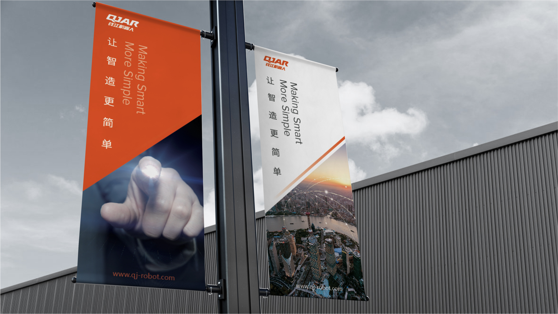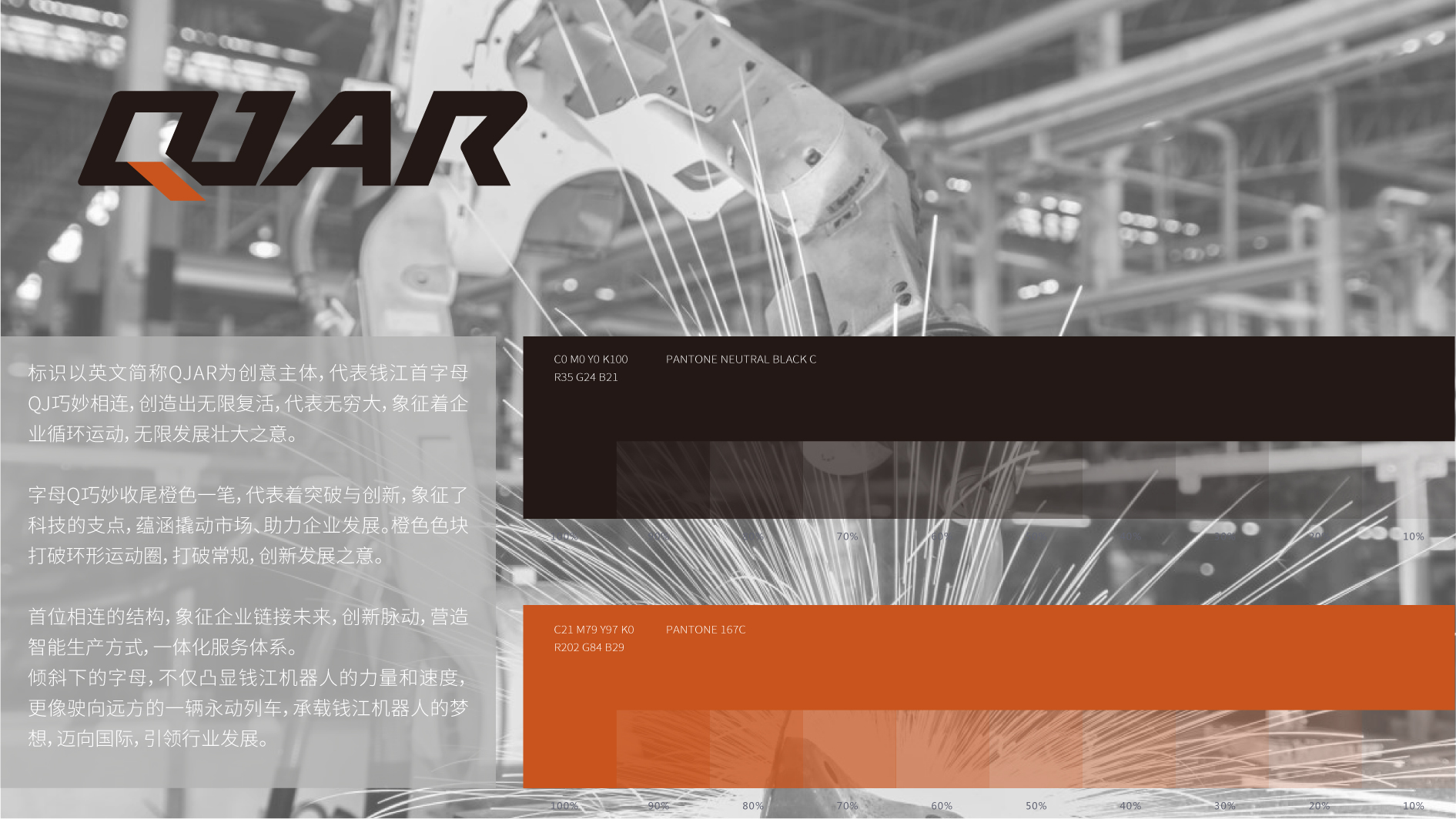 和與德深入調研其企業文化、主營業務,以錢江機器人英文簡稱QJAR為創意主體,代表錢江首字母QJ巧妙相連,創造出無限復活,象征著企業循環運動,無限發展壯大之意。傾斜的LOGO,凸顯錢江機器人的力量與速度,展現出錢江機器人“讓智造更簡單”的發展愿景。