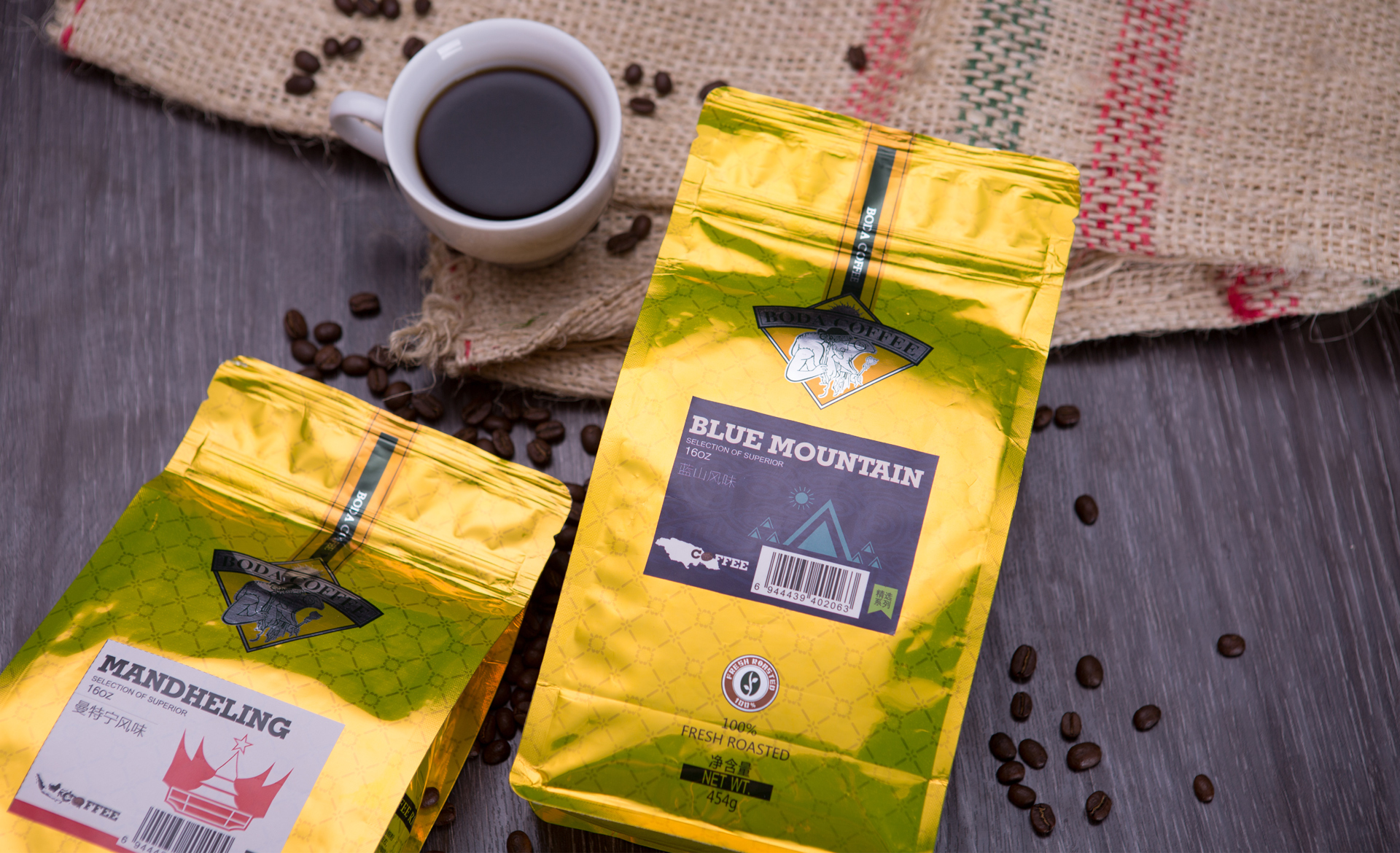 博達咖啡主打輕奢進口的咖啡粉,咖啡豆均源自牙買加,墨西哥,古巴,夏威夷等盛產咖啡豆的地方,其品類多且臻貴,是一個集融合全球81種臻稀咖啡品質的咖啡品牌。和與德結合全球咖啡豆產源地的自然和人文特色,作為包裝的主要設計亮點,其顏色也根據地區特色進行分類,整體包裝質感高級,特色鮮明。